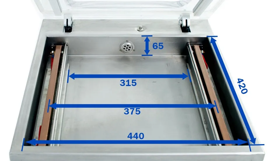 - Высокая производительность и надёжность. Мощный вакуумный насос производительностью 20 м³/ч и двухпозиционная сварная планка длиной 400 мм обеспечивают быстрый цикл упаковки. Напольное исполнение и цельнометаллическая конструкция гарантируют устойчивость при непрерывной работе.