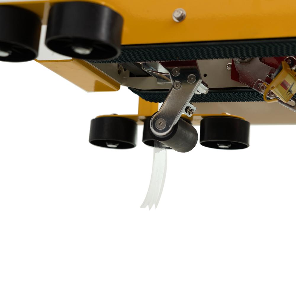 - Двухпоясная система протяжки. Верхние и нижние конвейерные ремни работают синхронно, обеспечивая стабильное движение даже тяжелых коробов (нагрузка до 20 кг). Исключается застревание и смещение ленты в процессе заклейки.